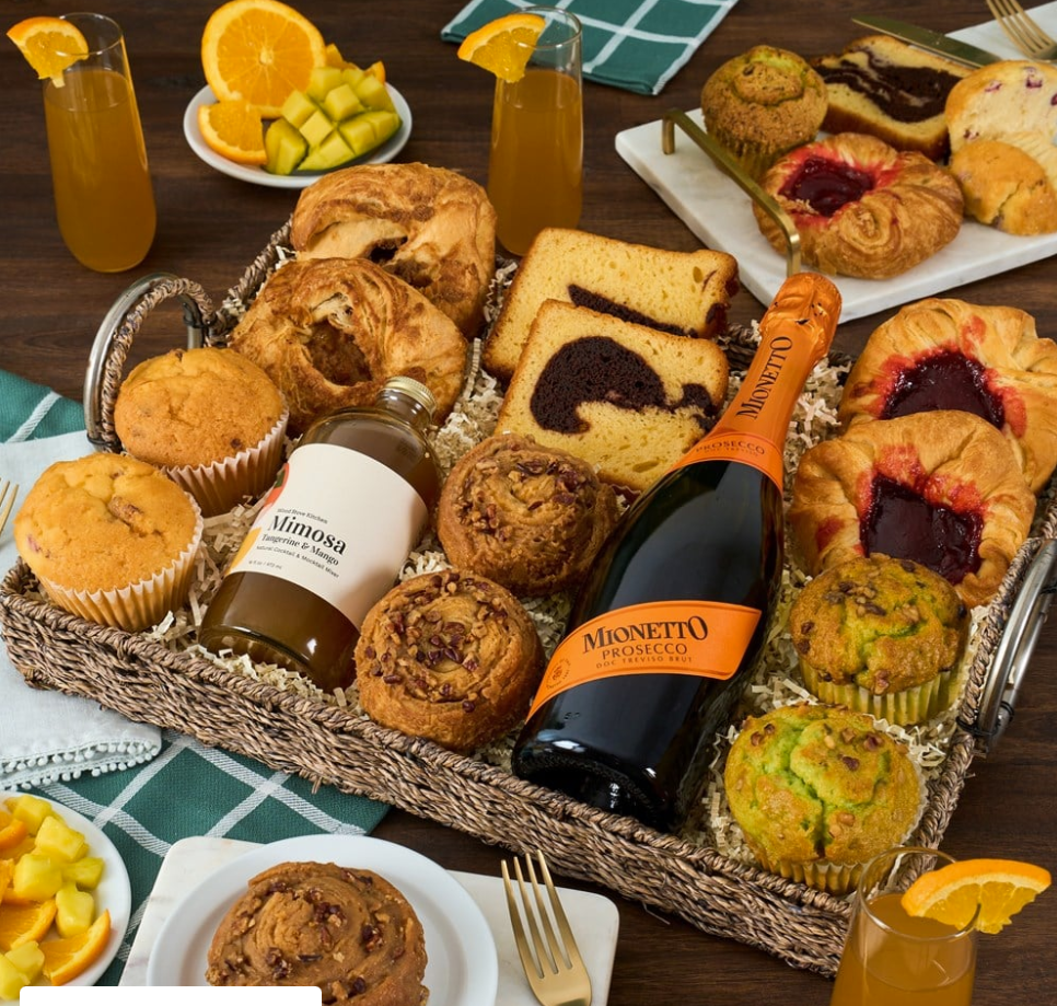 Gift Basket Includes: La Marca Prosecco 750mL Alc:1.1 Mimosa Mixer with Tangerine & Mango by Wood Stove Kitchen - 16 oz. Pecan Sticky Buns – Qty. 2 Apple Filled Croissant by GourmetGiftBaskets.com - 4.5 oz. - Qty. 2 Raspberry Filled Danish by GourmetGiftBaskets.com - 4.5 oz. - Qty.2 Pistachio Muffin by GourmetGiftBaskets.com - 4 oz. - Qty. 2 Chocolate Marble Tea Bread by GourmetGiftBaskets.com - 3 oz. - Qty.2 Apple Cinnamon Muffin by GourmetGiftBaskets.com - 4 oz. - Qty.2 Woven Seagrass Tray